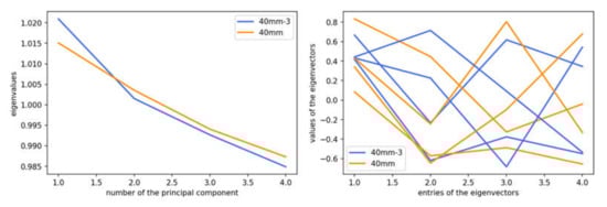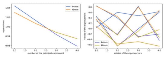 (left) Eigenvalues as a function of each principal component for the databases of the 44-mm ball and the 40-mm ball. (right) Values of the eigenvectors for the two cases.