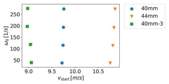 Figure 13, Figure 14 and Figure 15 show the most significant differences for the cluster centers of the four clusters for the different cases. The larger 44-mm ball showed higher initial velocities for all four cluster centers compared to the 40-mm ball, as shown also in previous work [], because the 40-mm ball was heavier, as discussed before (Figure 13).