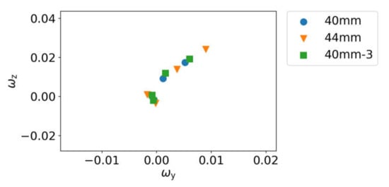 Larger ωz and ωy are visible in Figure 15 for the centers of the 40-mm case with increased net height and even stronger effects for the 44-mm ball, which had a smaller weight than the 40-mm ball. One needed larger spins to influence the trajectories of the 44-mm ball, because the effect of drag forces increased with larger size. The higher-net case needed stronger spins and reduced velocities for successful strokes. The ωz values were larger than the ωy contributions, meaning that stronger sidespin appeared, as discussed before.
