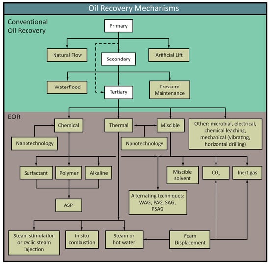 Scheme with the most relevant oil recovery techniques, from primary and secondary recoveries (or conventional mechanisms) to tertiary or enhanced oil recovery (EOR), and possible applications of nanotechnology in EOR. Figure adapted from Ref. [].