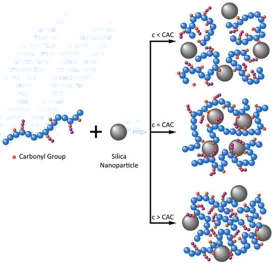 The interactions between nanoparticles and polymers as a function of their concentrations play a major role in their viscosifying properties. For example, a reinforced three-dimensional network structure was formed in the HAPAM/silica system []. The formation of this network is attributed to the chemical bonds created between carbonyl groups in the polymer backbone and silanol functionalities in the nanoparticles, considered to act as a sort of physical crosslinker among the macromolecules. Below a certain critical aggregation concentration (CAC), the intramolecular hydrophobic association is dominant in HAPAM solutions, forming small aggregates. In this condition, the polymer chains have a small chance of interacting with silica nanoparticles. As the polymer concentration increases to the CAC, inter-molecular hydrophobic associations become more predominant in the solution, thus creating a network of polymer chains. At even higher concentrations (>CAC), the strong associations caused by the number of hydrophobic groups have a negative effect on the interaction between polymer and silica nanoparticles (Figure 5).