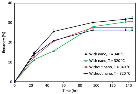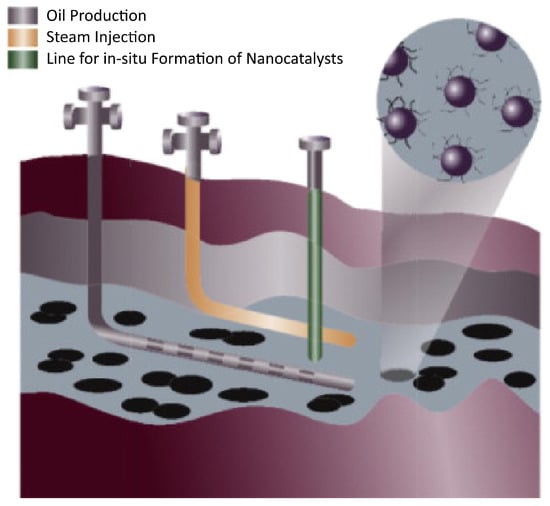 Nanofluids, mainly consisting of nano-sized colloidal dispersions, have successfully been developed in laboratories, and the upcoming challenge is to develop techniques for cost-efficient industrial-scale production techniques []. They can be designed to be compatible with reservoir fluids/rocks and be environmentally friendly []. Some newly developed nanofluids have shown extremely improved properties in applications such as drag reduction, binders for sand consolidation, gels, wettability alteration, and anticorrosive coatings [,]. In heavy oil reservoirs where EOR thermal production processes are usually utilized, the application of nanotechnology yielded several breakthroughs. Nanocatalysts for in-situ upgrading of heavy oil, what some authors have defined as an “underground refinery” [,,], constitute a novel approach to dealing with these systems.