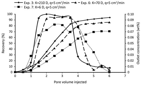 The retention of nanoparticles will alter some reservoir properties. For instance, nanoparticles modify the absolute permeability. This can be expressed as a function of the initial absolute permeability and a flow efficiency factor of the cross-sectional area open to flow []. Besides, the retention process also modifies the phases’ relative permeabilities, a product of the wettability alteration. The latter comes to a limit when all the surface of the rock are covered by the nanoparticles reaching the maximum wettability alteration in the porous media. From that moment on, further retention of nanoparticles will affect the porosity and absolute permeability []. Related to this phenomenon is the aggregation or creation of larger clusters with similar nanoparticles (i.e., homoaggregation) or other colloidal/suspended particles (i.e., heteroaggregation). This increment in the size, and therefore in its critical velocity, can lead to sedimentation in the channels or throats. Moreover, these clusters can subsequently capture free nanoparticles, leading to a secondary aggregation process, increasing their size until a critical “diameter” is reached and the cluster collapses and is divided into several smaller pieces. Both the adsorption of nanoparticles and the heteroaggregation processes depend on a number of factors, namely: type of rock formation, pH, and the ionic strength or the salinity. Nevertheless, not all collisions of nanoparticles will form clusters, since this could be hampered by, for instance, steric or electrostatic hindering [].