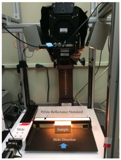 Hyperspectral images were collected on a push broom short-wave infrared (SWIR) system (Hyperspec ® SWIR, Headwall Photonics, Fitchburg, MA, USA) in the wavelength range 1000–2500 nm. The system (Figure 2) consisted of a spectrograph, a focal plane array with a Peltier-cooled 320 × 256 mercury cadmium telluride (MCT) detector (MCT-851 XC403, Xenics, Leuven, Belgium), a 30.7-mm front lens (OLES30, Specim, Oulu, Finland), two illumination sources with tungsten halogen lamps, a motorized linear slide (T-LSR300B, Zaber Technologies, Vancouver, BC, Canada), a computer, and in-house developed software (C++) for image acquisition and preprocessing, including intensity calibration and denoising. Two light sources oriented approximately 20 degrees from the sample were used for illumination. For each image, a scan of an individual sample started while a dark current reference was collected with the camera lens cap covering the lens. After acquiring about 10 lines of dark current signals, the lens cap was opened so that white reference signals were collected from a white diffuse-reflectance standard panel (Fluorilon-99W, Avian Technologies, Sunapee, NH, USA) with dimensions 25 mm × 300 mm, followed by scanning of sample (Figure 2). The spectra were collected at approximately 8-nm intervals over the wavelength range 1000–2500 nm. Due to the intensity of light, care was taken to not leave samples exposed to the light beyond the sample collection period. The background plate was stationary and black.