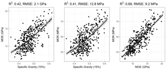 Wood property calibrations, statistical analyses, and associated graphics were developed using the R statistical software [] with the RStudio interface [] and the packages gridExtra [], pls [], prospectr [], signal [], and the tidyverse series of packages []. Models were developed between MOE and MOR with SGlumber, and MOR with MOE. Linear models were developed between MOR and MOE []. Examining the scatterplots between MOE and MOR with SGlumber showed that the relationships were not linear; several model forms were tested, with the best models being quadratic models without the linear term. For these models, the coefficient of determination (R2) and the root mean square error (RMSE) were calculated.