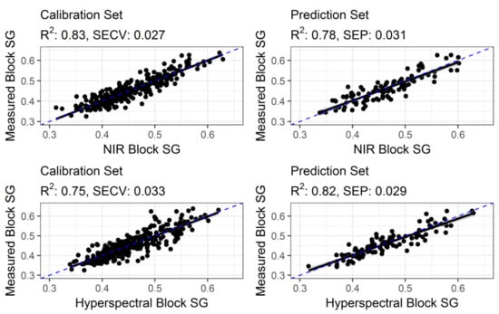 Calibration and prediction plots of block specific gravity for near-infrared spectroscopy and hyperspectral imaging. The dashed blue line indicates the line of equivalence.