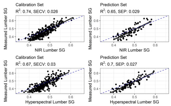 Calibration and prediction plots of lumber specific gravity for near-infrared spectroscopy and hyperspectral imaging. The dashed blue line indicates the line of equivalence.