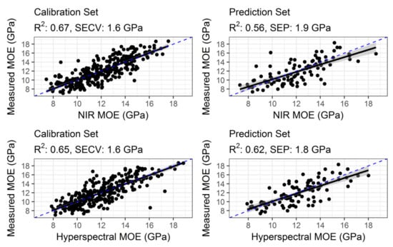 Calibration and prediction plots of modulus of elasticity (MOE) for near-infrared spectroscopy and hyperspectral imaging. The dashed blue line indicates the line of equivalence.