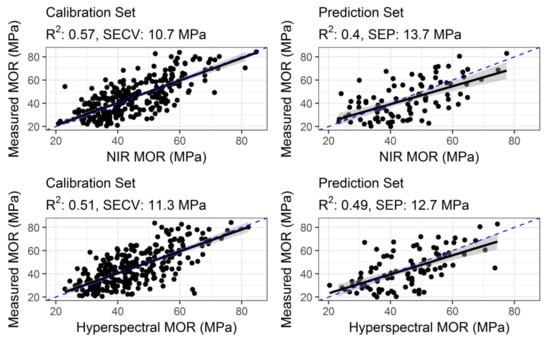 Calibration and prediction plots of modulus of rupture (MOR) for near-infrared spectroscopy and hyperspectral imaging. The dashed blue line indicates the line of equivalence.