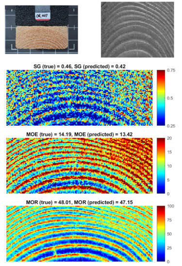 Following the creation of the PLS NIR-HSI models, the coefficients of the PLS model were used to predict the spatial variation within each block for SG, MOE, and MOR in Matlab. This work was similar to a calibration transfer from a spectrometer to a hyperspectral imaging system, done in Matlab. The pretreatment (Savitzky–Golay filtering) process was exactly replicated in Matlab. Spectral data in each image were folded to a matrix form. The PLS model coefficients in a CSV-format file (in Supplementary Materials) were read and applied to the spectrum in each pixel via a matrix form. The output results were refolded back to an image domain, where each pixel contained prediction values for SG, MOE or MOR, depending on a PLSR model. Finally, the prediction images were converted to pseudo-color, where each pixel value was represented with a standardized color.