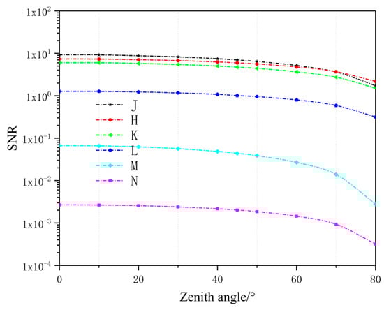 The short infrared band had a better response. Generally, SNR defined as greater than five at the basis of the target can be effectively detected. Using our calculation parameters, only the J, H, and K bands could identify the target due to the elliptical trajectory of the satellite. With the increase of the zenith angle, the gap between the J band and H band became smaller. Until 68 degrees of the zenith angle, the detectability of the H band was better than the J band. The K band was always smaller than the other two bands.