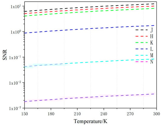The use of reflected sunlight as a target energy is inaccurate, as the constant motion of the target causes the reflected sunlight to become irregular, and the satellite’s own working components also radiate energy. Therefore, our model used temperature as a standard for calculation [,]. The space target temperature ranged from 150–300 K at a zenith angle of 45 degrees, as shown in Figure 5. At different center wavelengths, the bandwidth was proportional to the sensitivity of the SNR [] and the N band had the most notable promotion. Thus, at the same range of temperature, the selection of bandwidth had an influence on the noise immunity of the system.