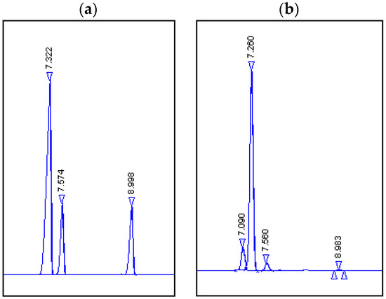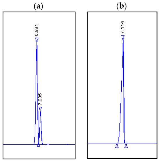 Chromatograms. (a) Products obtained by biotransformation using carrots: Rf = 6.891, (1R,2R,4R)-dihydrocarveol (4) and (1R,2S,4R)-neodihydrocarveol (5); unreacted substrate: Rf = 7.035, (1R, 4R)-(+)-dihydrocarvone (2). (b) Standard: Rf = 7.114 (1R, 4R)-(+)-dihydrocarvone (2).