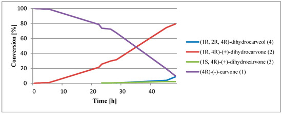 Analyzing the results, it was found that by far the largest loss of substrate occurred on the second day of biotransformation. A steady decrease in the content of (4R)-(–)-carvone (1) may indicate a stable level of oxidoreductases during biotransformation.