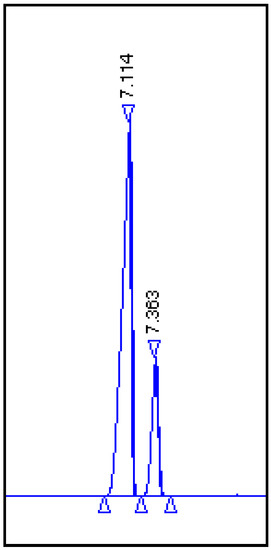 Chromatogram of the (+)-dihydrocarvone mixture of two diasteoisomers: trans (1R, 4R)-(+)-dihydrocarvone (2) with Rf = 7.114 and cis (1S, 4R)-(+)-dihydrocarvone (3) with Rf = 7.363.