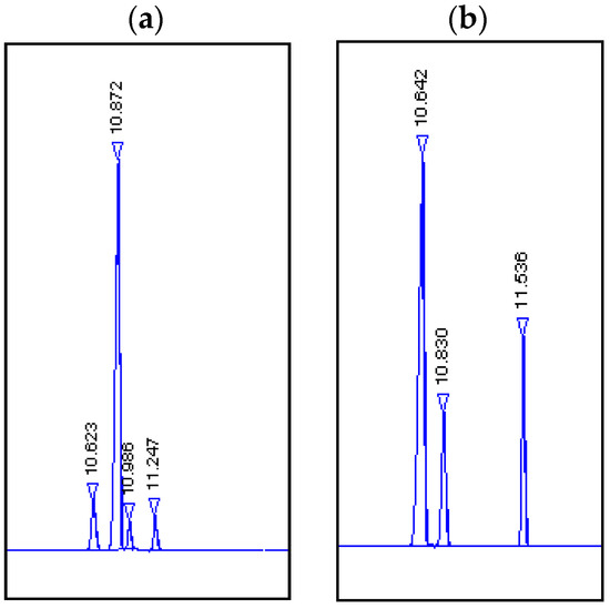 Chromatograms. (a) Products obtained by biotransformation using potato: Rf =10.623, (1S,4S)-dihydrocarvone (8); Rf =10.872 (1R,4S)-dihydrocarvone (7); Rf =10.986 dihydrocarveol (9); Rf =11.247 dihydrocarveol (10). (b) Standards: Rf =10.642, (1S,4S)-dihydrocarvone, Rf =10.830, (1R,4S)-dihydrocarvone; Rf =11.536 (4S)-(+)-carvone (6).