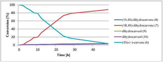 In order to verify the course of the biotransformation over time, a suitable number of flasks with biocatalysts were prepared as described above in the screening procedure. The reactions were terminated after 1, 2, 3, 5, 22, 23, 26, 28, 45, and 48 h in the case of (4R)-(–)-carvone (1) and after 2, 4, 6, 8, 10, 12, 24, 28, and 48 h for (4S)-(+)-carvone (6).