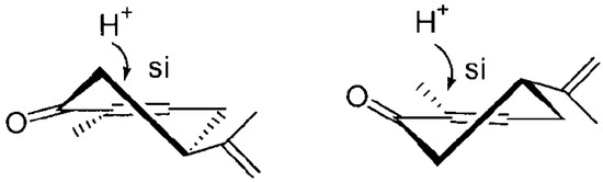 In this study, the trans or cis addition was examined depending on the carvone enantiomer. In the case of (4R)-(–)-carvone (1), compound (2) was formed (trans product), while from (4S)-(+)-carvone (6), cis-dihydrocarvone (7) was formed.
