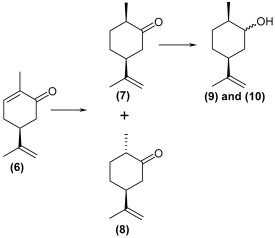 Scheme of the (4S)-(+)-carvone (6) reduction reaction.
