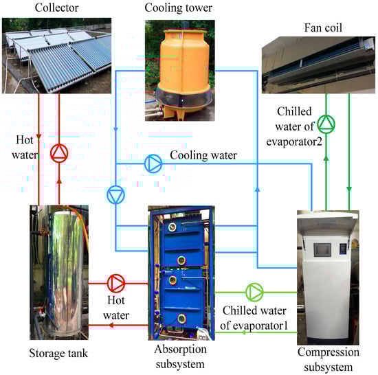 The prototype of the SASCHCS is developed to verify the model. The corresponding prototype and its schematics are exhibited in Figure 1 and Figure 2, respectively. The prototype consists of the collector, storage tank, absorption subsystem, compression subsystem, cooling tower, fan coil, water pump, tube, and valve. The condition of the prototype is listed in Table 1. It should be noticed that the UA for different heat exchangers is obtained by the regression of operational data.