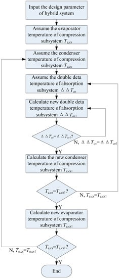 The off-design model of the SASCHCS is solved by the FORTRAN program. The solving process is exhibited in Figure 3. As shown, the introduction of a characteristic equation simplifies the iteration significantly, i.e., the calculation of the absorption subsystem depends only on the iteration, instead of the four heat exchangers (generator, condenser, evaporator, and absorber). Accordingly, the solving time reduces to approximately 20 s and the model is converged for a wide range of operational conditions. The thermodynamic properties of water and R410A are calculated by the software Refprop9 []. The convergence is thought to be reached when the deviation is less than 0.01.