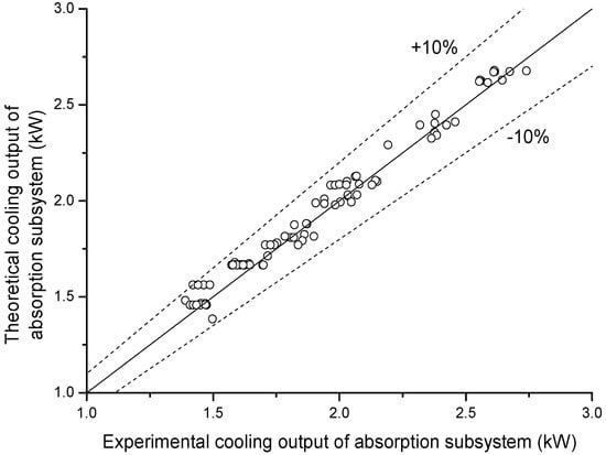 The deviation between the simulation result and operational data with respect to the absorption subsystem is shown in Figure 4. The flow rate of hot water, cooling water and chilled water of the absorption subsystem during the experiment is the same as the design condition exhibited in Table 1. The inlet temperature of the hot water changes from 50 °C to 70 °C. The inlet temperature of the cooling water ranges from 30 °C to 32 °C. In addition, the temperature of the chilled water depends primarily on the cooling capacity of the absorption subsystem. The greater the cooling output, the lower the temperature of the chilled water becomes. The corresponding inlet temperature of the chilled water is approximately 16 °C to 30 °C. Each data of the experiment was measured in the steady condition. A good agreement was obtained. Most of the deviations are less than 10%.