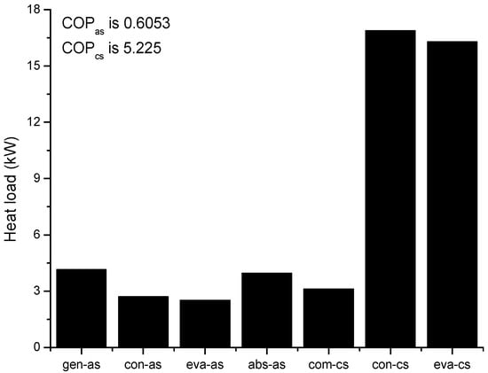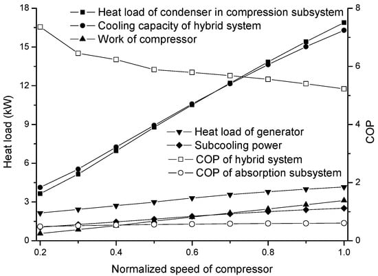 The heat load and COP for different compressor speeds are exhibited in Figure 13. For the compression subsystem, because the heat load and cooling output decrease with the decrease in the compressor speed, the condenser temperature decreases and the evaporator temperature increases. Accordingly, this change is adverse to the operation of the absorption subsystem but favorable for the performance of the compression subsystem. The heat load of the generator, cooling capacity and COP of the absorption subsystem goes down by 48.52%, 58.6% and 19.58%, respectively, when the speed of the compressor lowers by 80%. In addition, the heat load of the condenser in the compression subsystem, the work of the compressor and the cooling output of hybrid system drops by 78.46%, 82.04% and 74.7%, respectively. The COP of the hybrid system goes up by 40.8%.