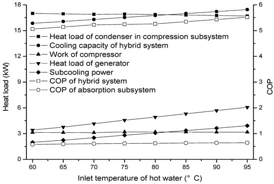 The heat load and COP for different inlet temperatures of the hot water are exhibited in Figure 6. It is seen that the heat load of the generator and the cooling capacity of the absorption subsystem grow with the enhancement of the hot water temperature, owing to the rise of the generator temperature. Because the cooling output of the absorption subsystem serves as the subcooling power in the compression subsystem, the performance of the hybrid system also becomes better with the increase of inlet temperature in the hot water. The heat load of the generator and the cooling output of the absorption subsystem and hybrid system rises by 77.15%, 97.63% and 10.07%, respectively, when the inlet temperature of the hot water enhances by 35 °C. Meanwhile, the COP of the absorption and hybrid subsystem increases by 11.55% and 9.01%, respectively. Moreover, the heat load of the condenser in the compression subsystem and compressor work is insensitive to the change of the hot water temperature, which is similar to the trend of our previous study [].