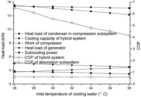 The heat load and COP for different inlet temperatures of the cooling water are shown in Figure 7. It is noteworthy that the cooling water of the absorber and two condensers are from the same cooling tower. Hence, the variation of cooling water temperature influences the above-mentioned three components and results in two opposite behaviors regarding the absorption subsystem. The improvement of the cooling water temperature in the condenser of the compression subsystem increases the chilled water temperature of the absorption subsystem, i.e., the inlet/outlet temperature of circulation water in the subcooler goes up from 9.48 °C/7.19 °C to 18.8 °C/16.75 °C when the inlet temperature of the cooling water rises from 26 °C to 32 °C, increasing the cooling capacity and COP of the absorption subsystem. However, the absorber temperature and condenser temperature in the absorption chiller enhances as well and leads to the deterioration of performance. It is seen that the performance of the absorption subsystem deteriorates with the rise of the cooling water temperature because the neglect influence is stronger. In addition, the compressor work goes up and the condenser heat load, cooling capacity, as well as the COP of the compression subsystem reduces with the rise of the cooling water temperature, as expected. The heat load of the generator, evaporator in the absorption subsystem, and the condenser and evaporator in the compression subsystem falls by 17.71%, 21.02%, 2.61% and 11.93%, respectively, and the work of the compressor grows by 38.65% when the inlet temperature of the cooling water rises by 12 °C. Simultaneously, the COP of the absorption and hybrid system drops by 4.02% and 36.48%, respectively.