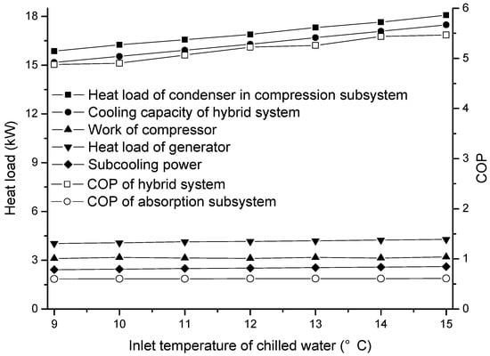 The heat load and COP for the different inlet temperatures of the chilled water are shown in Figure 8. The increase in the inlet temperature in the chilled water increases the suction density of the compressor such that the flow rate of the refrigerant in the compression subsystem increases. It can be inferred that the subcooling of the compression subsystem decreases in this condition. In addition, the condenser temperature increases with the increasing chilled water temperature []. Therefore, the abovementioned effect increases the R410A temperature in the subcooler and the consequent improvement in the circulation water temperature of the subcooler. However, this increase of chilled water in the absorption subsystem is not notable, i.e., the inlet/outlet temperature of chilled water in the absorption subsystem enhances from 18.12 °C/16.14 °C to 19.44 °C/17.31 °C as the inlet temperature of the chilled water rises from 9 °C to 15 °C. Consequently, the heat load of the generator, cooling output and COP of the absorption subsystem just goes up by 6.33%, 7.72% and 1.31%, respectively, when the inlet temperature of the chilled water rises by 6 °C. Besides, the performance of the hybrid system benefits from the rise of the chilled water temperature. The heat load of the condenser in the compression subsystem, cooling capacity and COP of the hybrid system increases by 13.94%, 15.23% and 12.1%, respectively. For the compressor, the dependence of its consumption on the chilled water temperature is weak, owing to the decrease of the pressure ratio.