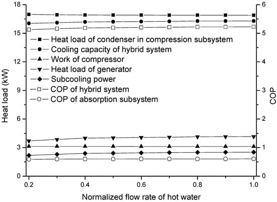 The heat load and COP for different flow rates of hot water are shown in Figure 9. The decline of flow rate in the hot water decreases the generator temperature and the performance of the absorption subsystem. The heat load of the generator, cooling capacity and COP of the absorption subsystem comes down by 10.87%, 13.11% and 2.52%, respectively when the flow rate of hot water reduces by 80%. It can be inferred that the effect of the flow rate in the hot water on the performance of the compression subsystem is weak due to the slight variation of the subcooling power. The cooling capacity and COP of the hybrid system goes down by 1.55% and 1.89%, respectively. Especially, the change of condenser heat load in the compression subsystem and the work of the compressor can be ignored.