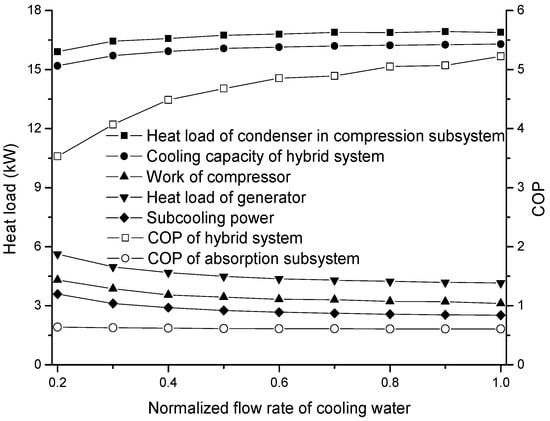 The heat load and COP for different flow rates of cooling water in the compression subsystem are displayed in Figure 10. As shown, the condenser temperature increases and the evaporator temperature maintains nearly constant with the decrease in the flow rate in the cooling water for the vapor compression chiller []. The improvement of the condenser temperature in the compression subsystem increases the temperature of the circulating water in the subcooler, resulting in the performance improvement of the absorption subsystem. However, the above-mentioned advantage is offset by the high condenser temperature of the compression subsystem, and leads to the poor performance of the hybrid system. The heat load of the generator, cooling capacity and COP of the absorption subsystem increases by 35.13%, 42.47% and 5.43%, respectively, as the flow rate of the cooling water in the compression subsystem goes down by 80%. However, simultaneously, the heat load of the condenser in the compression subsystem, cooling out and COP of the hybrid system comes down by 5.81%, 6.74% and 32.44%, respectively, and the compressor work rises by 38.04%.