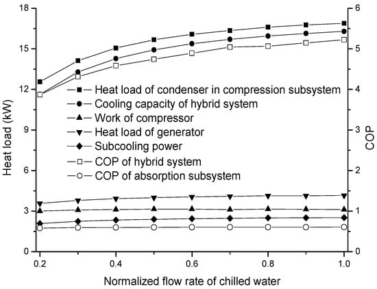 The heat load and COP for different flow rates of chilled water are shown in Figure 11. As shown, the evaporator and condenser temperatures decrease with the decrease in flow rate in the chilled water for the vapor compression chiller []. Therefore, it can be inferred that the performances of the absorption and compression subsystems deteriorate when the flow rate of the chilled water decreases. The heat load of the generator, cooling capacity and COP of the absorption subsystem lowers by 14.28%, 17.24% and 3.45%, respectively, when the flow rate of chilled water comes down by 80%. In addition, the heat load of the condenser in the compression subsystem, compressor work, cooling out and COP of the hybrid system falls by 25.62%, 3.56%, 28.55% and 25.91%, respectively. The insignificant variation of the compressor work is attributed to the relatively smaller change of the pressure ratio caused by the simultaneous decline of the evaporator and condenser pressure.
