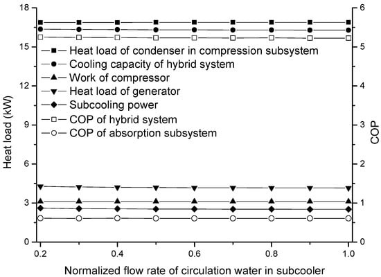 The off-design performance with the flow rate of circulation water in the subcooler is shown in Figure 12. The inlet and outlet temperature of the circulating water is strongly coupled with the corresponding flow rate. The less the flow rate is, the higher the temperature of the circulating water becomes. In addition, the multiplication of temperature difference and flow rate in the circulation water is nearly constant, i.e., the temperature difference goes up from 2.15 °C from 5.2 °C as the flow rate goes down by 40%. This trend means that the flow rate of the circulating water in the subcooler has a tiny effect on the performance of the absorption subsystem. Hence, the heat load of the component and COP in the hybrid system is thought to be independent of it as well.
