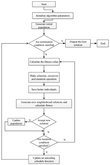 Algorithm flowchart of the hybrid genetic simulated annealing (HGSA) algorithm.
