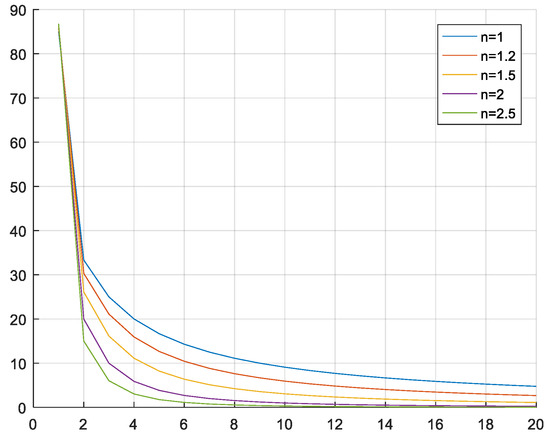 where α is a small constant, k represents the number of iterations, n represents the Hill coefficient (n ≥ 1), ΔT is the difference between the current temperature (k + 1) and the previous temperature (k), and ΔT < 0. The effect of the annealing rate function in the case of k = 20, n = 1; 1.2; 1.5; 2.5 is shown in Figure 5. In this paper, the value of n is chosen to be 1.5.