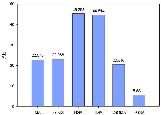 where zopt is the known upper bound value for each instance, zi is the optimal makespan of each algorithm, and K is the number of instances. The average error comparison results of several algorithms are shown in Figure 7. As can be seen from the figure, the lowest AE value of HGSA in this paper was 5.58, which was lower than the lowest value of 20.516 for the DSOMA algorithm.