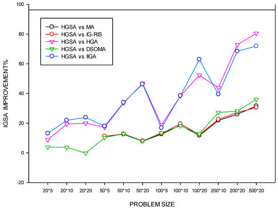 where CHGSA is the minimum makespan obtained by the HGSA algorithm, and CX is the minimum makespan obtained by the other algorithms. Figure 8 shows the percentage improvement on makespan of the HGSA algorithm compared to the MA, IG-RIS, IIGA, and DSOMA algorithms. It can be seen from the figure that the superiority of the HGSA algorithm is not obvious compared with other algorithms when the scale of the benchmark is small. In the 20 × 20 instances, the HGSA algorithm performed slightly weaker than the DSOMA algorithm. However, with the increase of instances scale, that is, the increasing of workpieces and machine tools number, the advantages of HGSA became increasingly obvious. In the 500 × 20 instances, HGSA had an improvement of 31.7%, 30.5%, 80.6%, 36.1%, and 71.9% compared to MA, G-RIS, HGA, DSOMA, and IIGA, respectively. As the scale of instances increased, the improvement effect was more obvious, indicating that the algorithm performed better when the schedule was larger.