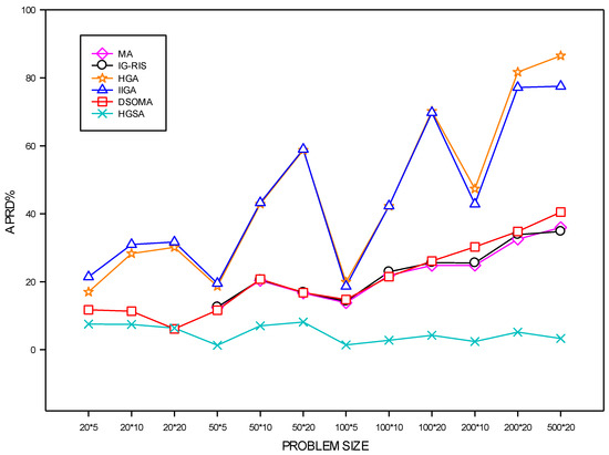 where K is the number of the same scale instances, Cxi is the makespan of the algorithm x on the ith instance of the same size, and Copti is the optimal value on the ith instance of the same size. Figure 9 shows that the ARPD of HGSA was similar to that of the DSOMA algorithm in the 20 × 20 instances, which was approximately 6%. In the other instances, the ARPD of HGSA, which were all less than 9%, was significantly lower than that of the existing algorithms. This demonstrates that the results obtained by our HGSA algorithm can be closer to the theoretical optimal values (upper bound) of these benchmark instances. Furthermore, the results show that HGSA performs well when the population size of jobs and the number of machines increases. Furthermore, the results show that HGSA performs well when the population size of jobs and the number of machines increases.
