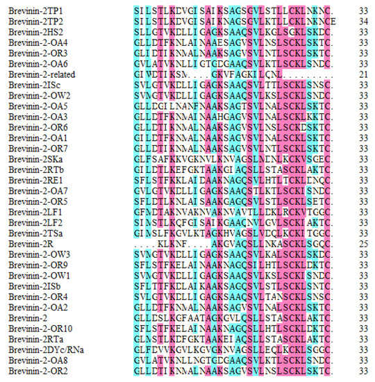Antibacterial peptides (AMPs) defend the body against exogenous pathogens. AMPs are an important part of the body’s immune system and are generally composed of 10–50 amino acids [21]. It is anticipated that traditional antibiotics such as penicillin will be replaced by new antibacterial peptide drugs [22]. AMPs are expected to solve the problem of drug resistance in pathogenic bacteria [23]. Brevinin-2 is a family of peptides that has been found in the skin of certain Japanese frogs [24]. By 2018, there had been 86 peptides belonging to the Brevinin-2 family added to the Antimicrobial Peptide Database (APD) [25]. This family has 33 AMPs. Amino acid residues of homologous analysis showed that the members of the Brevinin-2 family have significant interspecific and intraspecific structural differences, with the exception of four conservative amino acid residues (Lys15, Cys27, Lys28, and Cys33) [26]. Brevinin-2 peptides derived from the pool frog and belly frog demonstrated inhibitory activity (Minimum Inhibitory Concentration (MIC) < 10 mmol/L) against the gram-negative bacterium Escherichia coli, the gram-positive bacteria S. aureus, and the fungus Candida albicans [27,28]. The hemolytic activity of the Brevinin-2 family is weaker than that of the Brevinin-1 family. Therefore, the Brevinin-2 family has a higher medical research potential [29].