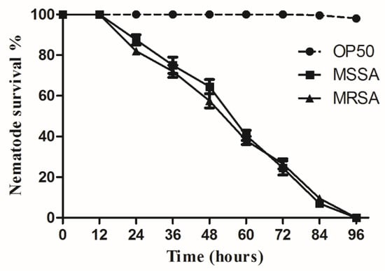 A significant survival rate reduction was observed in C. elegans infected with MSSA and MRSA using liquid-based assays (Figure 2) [7]. Worm survival rates dropped sharply between 24 h to 96 h in M9 buffer and S. aureus culture. Exposure to MSSA and MRSA took four to five days to kill all C. elegans. In a liquid medium, the worms infected by MSSA and MRSA started to die after 12 h of exposure to the pathogen. As MSSA and MRSA induced similar mortality rates in the nematodes, the following experiments were conducted only with MRSA, which is more relevant to clinical and pharmaceutical settings.