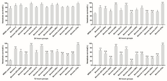 A 24-well plate was filled with MSSA and MRSA in a liquid medium (S. aureus/M9 buffer, 1:4, 16 h culture, and 10 μg/mL cholesterol in the culture) and 20 transformed synchronized L4 worms were placed in each well. E. coli OP50, C. elegans, and M9 buffer served as the control [39]. Each treatment was repeated in at least three replicates. The incubated plate was stored under 25 °C and the survival rate was checked every 12 h. Survival rate was calculated by counting the number of living nematodes remaining in the treatment group at the corresponding time—dead nematodes are dark, stiff, and easy to distinguish from living nematodes.