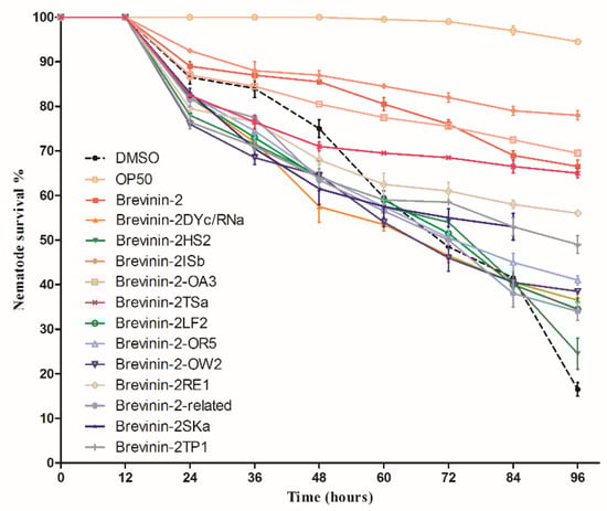 A screening in 24-well plates was performed with MRSA–C. elegans to identify potential anti-infective peptides that improved the survival rate of C. elegans [46]. Thirteen peptides were screened and demonstrated varying increased survival rates of MRSA-infected nematodes (Figure 3). The adapted standard to classify the positive peptides refers to the “Anti-infective screening of Brevinin-2 family”. All of the positive peptides contributed to a C. elegans survival rate of more than 60% following infection and treatment for 72 h compared to a survival rate of about 20% in untreated controls (Figure 3). Brevinin-2 and Brevinin-2-OA3 significantly increased the nematode survival rate by nearly 4.2-fold, while Brevinin-2ISb and Brevinin-2TSa increased the survival rate by at least 6.3-fold after 96 h. Only these four peptides increased the nematode survival rate above 60% after 96 h. The control worms were fed on MRSA during the assay.