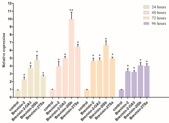 Assessment of the antibacterial gene expression in C. elegans, stimulated by the Brevinin-2 family peptides Brevinin-2, Brevinin-2-OA3, Brevinin-2ISb, and Brevinin-2TSa (the last of which showed the best treatment-related effect), confirmed that these peptides activated lys-7 expression in innate immunity pathways. The experimental group was treated for 24 h, 48 h, 72 h, and 96 h. OP50 was used as the control treatment. The expression of lys-7 was consistent. Only Brevinin-2-OA3, Brevinin-2ISb, and Brevinin-2TSa could both inhibit the growth of methicillin-resistant S. aureus and play an active role in the innate immunity system (Figure 5). Brevinin-2ISb was the most effective of the group.