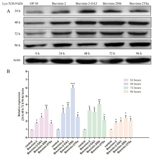 The experimental group was treated for 24 h, 48 h, 72 h, and 96 h. OP50 was the control. Western blotting showed differential increase levels of lys-7 upon exposure to the MIC of Brevinin-2, Brevinin-2-OA3, Brevinin-2ISb, and Brevinin-2TSa (Figure 6). This indicated that the protein expression of lys-7 was up-regulated in the C. elegans that was induced by Brevinin-2, Brevinin-2-OA3, Brevinin-2ISb, and Brevinin-2TSa. The effect of Brevinin-2ISb was the highest (5.987 fold at 48 h).