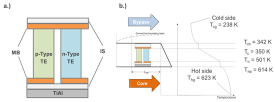 The performance of today’s aero-engines is already optimized to a high level. Further improvement by means of known concepts seems increasingly difficult and new technologies have to be considered in order to reduce the fuel consumption and environmental pollution of future aircrafts and to move closer to the specified goals by ACARE [14] and Flightpath 2050 [15]. This is linked to the fact that the thermal efficiency of gas turbines is mainly determined by the overall pressure ratio and the turbine entry temperature [16]. The increase of both parameters requires new material solutions that are investigated extensively. Another possibility for improvement is given by the management of heat flow, in order to decrease the amount of waste heat of engines that is lost to the environment. For this reason, focus is put on the recuperation of engine waste heat [16,17]. Conducted works on TE high power applications in the hot gas environment have been restricted over the years to basic assessments from estimated temperature differentials and approximated heat flux conditions [18,19,20]. These studies led to restrained conclusions on the resulting performance and the assessment of a lacking technological and economic efficiency of TEG. Although admittedly lower in today’s achievable efficiencies, TEG still avoids additional complex thermodynamic cycles, corresponding installations, and their handling for the jet engine system. This principally corresponds to an easy implementation and lower maintenance effort when compared to other emerging heat engine technologies (e.g., Organic Rankine Cycle).