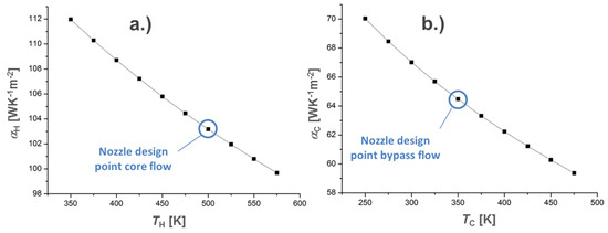 Temperature dependent convective heat transfer coefficients at the hot core stream (a) and the cool bypass flow (b). The depicted design points indicate values for a thermoelectric module with a filling factor of F = 25% and an adjusted length of the thermoelectric legs of 21.2 mm for the matching of thermal resistance.