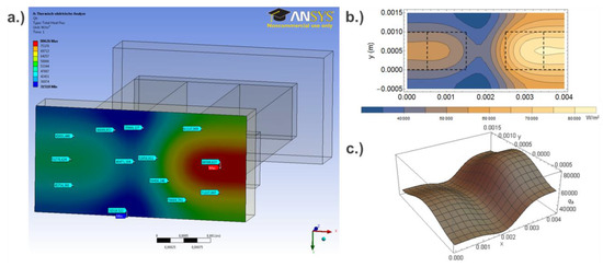 Qualitative heat flow distribution on the hot side of the thermocouple for an exemplary set of boundary conditions and geometrical thermocouple design (a), areal interpolation of discrete node data on the normal component of the heat flux vector (b), and continuous area function of the heat flux on the hot side (c).
