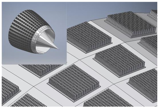 Example for an occupation of the nozzle surface by TE modules (TEM) (Courtesy of Fabian Ahrendts, TU Braunschweig). The shown design implies the application of vertical bars for improved heat exchange at the bypass flow, which is not considered in the simulation. Inset: Overall vision of TEM alignment on an aviation nozzle.