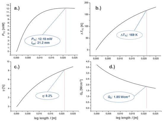 Due to the thermal resistance of the convective boundary layers at the core and bypass flow, only a fraction of the gas temperature difference can be used at the TE material, which limits the maximum power output and efficiency of the thermocouples. In presence of external thermal resistances the temperature difference at the TE material is a function of the leg length. For small leg lengths, the reduced thermal resistance of the TE leg yields a high incident heat flow but low temperature difference across the legs. Consequently, the power output and the efficiency also become low. Though high leg lengths provide an increase of the temperature difference, the increasing thermal resistance of the thermocouple lowers the incident heat flow, which yields a reduction of the power output above a certain leg length, likewise. Hence, as explained above, maximum output power is achieved for an optimal intermediate leg length based on matching leg and parasitic thermal resistances [30].